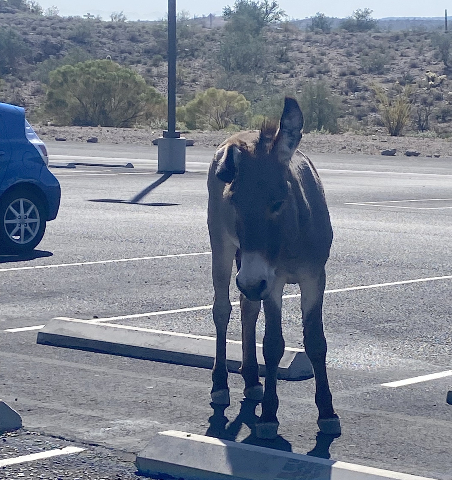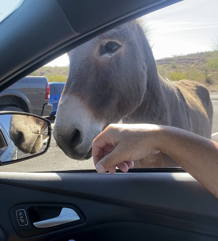 | This burro was watching us as we drove into the parking lot and slowly pulled up next to her. She timidly walked up to the passenger window and whispered to Mike... |