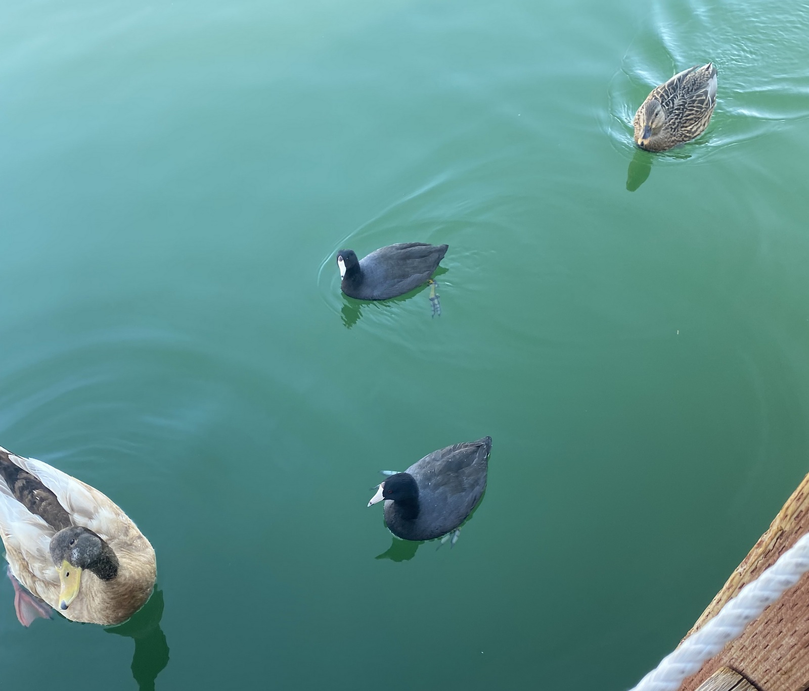 catfish fillet with cole slaw. As we were finishing our meal a few ducks come swimming up very slowly to the rail. The male Mallard looks up at Mike side-eyed and with his Donald Duck voice says... |