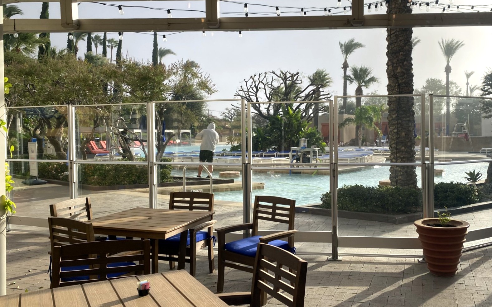 | The pool area from the Casino Cafe. Can't tell that there is a windstorm. Seen one, you've seen them all. Haha! |
