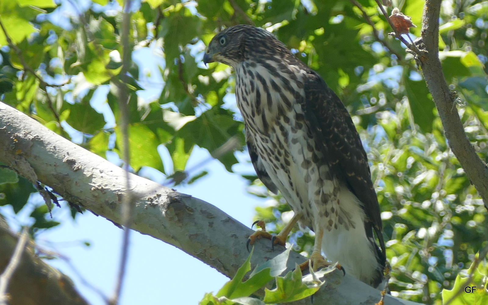 | Two fledgling Cooper's Hawks In July 2025 I heard them from the yard. So June and I headed across the street to the Vernal Pools. She spotted them in adjacent trees talking to each other. |